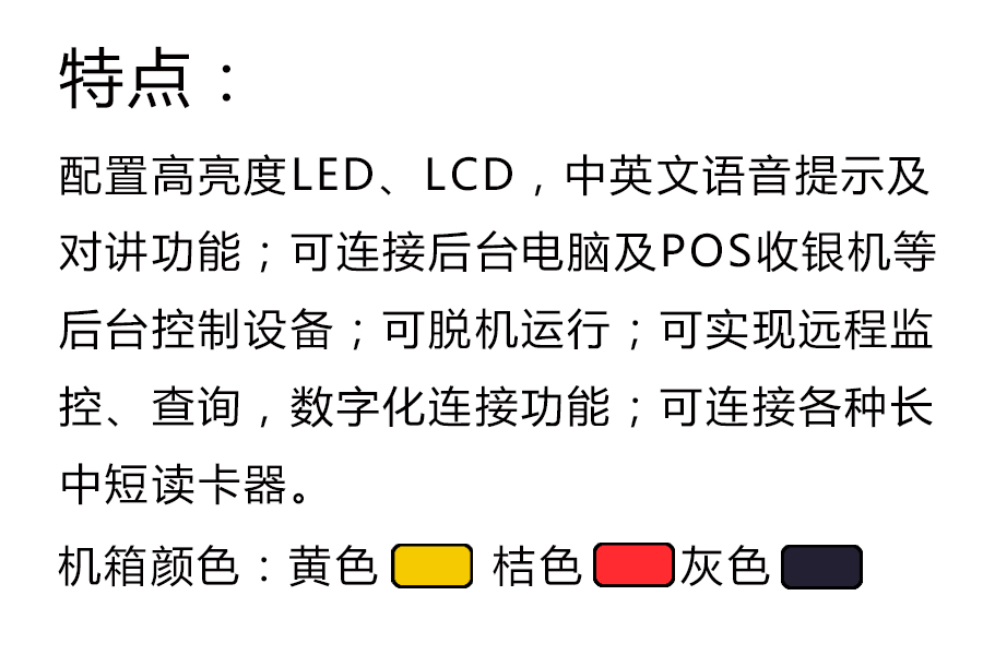 2、可實現自動出卡,圖像對比,語音提示及IC/ID顯示計費功能。